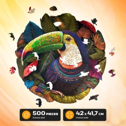 Te designerskie drewniane puzzle z kolorowym tukanem zapewnią godziny zabawy i staną się piękną dekoracją wnętrza. Każdy z 500 unikatowych elementów jest precyzyjnie wycięty z 5‑mm drewna z certyfikatem FSC, dzięki czemu wygodnie się je układa i dobrze trzymają kształt. Nowoczesny druk UV wydobywa kolory i detale, a gotowy obraz doskonale ozdobi ścianę.