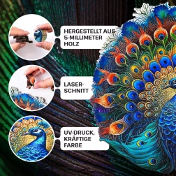 Dzięki nowoczesnej technologii cyfrowego druku UV obraz pawia jest realistyczny i pełen życia, zachwycając kolorystyką. Drewno certyfikowane FSC® gwarantuje wymaganą jakość i przyczynia się do ochrony bioróżnorodności. Puzzle zostały zaprojektowane tak, aby rozwijać logiczne myślenie i motorykę małą; w zestawie znajduje się folia do podklejenia, ozdobne pudełko oraz instrukcja.