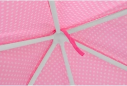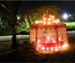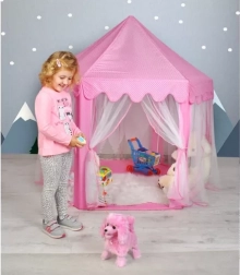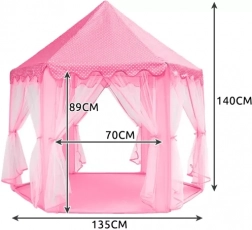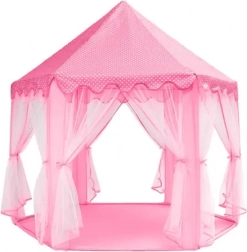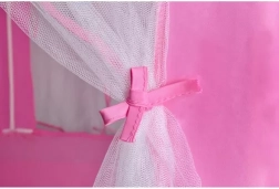 Ten różowy namiot dla dzieci tworzy przytulny „pałac”, w którym rozwija się dziecięca wyobraźnia. Sześciokątna podstawa zapewnia dużo miejsca na poduszki, pluszaki i książki, a przezroczyste zasłonki z siateczki przy sześciu wejściach dają poczucie prywatności i jednocześnie zapewniają świetną cyrkulację powietrza. Namiot jest odpowiedni do zabawy dla maksymalnie 2 dzieci pod nadzorem dorosłych.