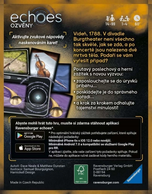 Echoes: Skrzypce przeniesie cię do Wiednia roku 1788, gdzie po wielkim koncercie pozostają dwa martwe ciała i wiele niewyjaśnionych pytań. Twoim zadaniem jest słuchać podpowiedzi audio, łączyć poszlaki i ułożyć wydarzenia we właściwej kolejności. Dzięki unikalnemu połączeniu ścieżek dźwiękowych i fizycznych kart doświadczysz śledztwa jak nigdy dotąd.