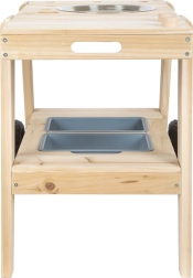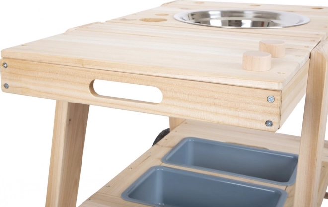 Dwie wyjmowane miski i stalowy zlew zachęcają do mieszania, nabierania i „gotowania”. Idealna alternatywa dla piaskownicy, wspierająca rozwój zmysłów i wyobraźni.