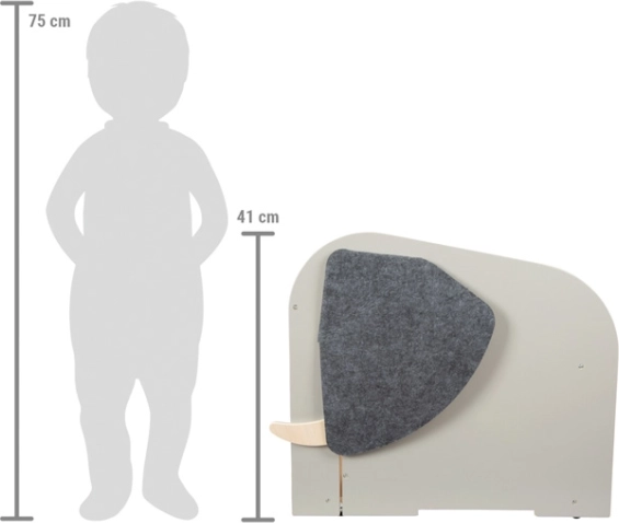 Pudełko oferuje dużo miejsca na przechowywanie większych zabawek, przednie przegródki na książki i przybory piśmiennicze, a między „kłami” skrywa wysuwaną rurkę do zawieszenia rolki papieru do rysowania. Wysokiej jakości filcowe uszy zakrywają tajne otwory, obrotowy „słoniowy ogon” służy jako wygodny uchwyt do otwierania i zamykania oraz może ukryć drobiazgi.