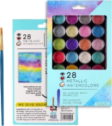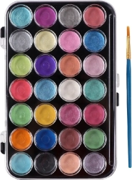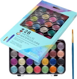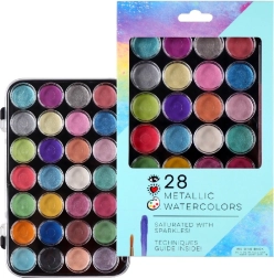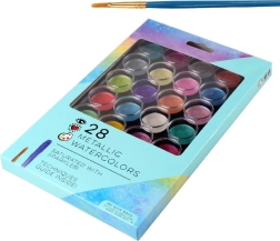 Odkryj nieskończone możliwości zabawy kolorem i twórz własne, oryginalne obrazy. Ten praktyczny, kompaktowy zestaw 28 akwareli w pięknych, metalicznych odcieniach pozwoli każdemu wyrazić swoją kreatywność. Zestaw zamknięty jest w plastikowym etui, które chroni farby przed wysychaniem i ułatwia ich codzienne użytkowanie. W komplecie znajduje się pędzelek oraz krótki przewodnik po technikach akwarelowych. Dzięki niemu każdy nauczy się łączyć kolory i tworzyć nowe odcienie. To idealny prezent dla dzieci, przyjaciół, dla każdego, kto lubi malować.