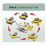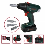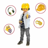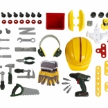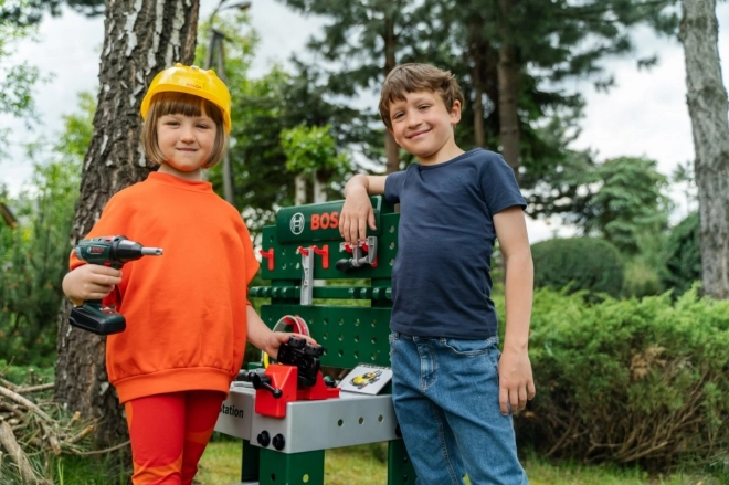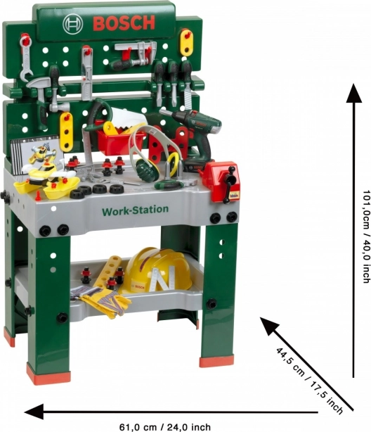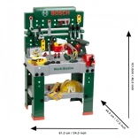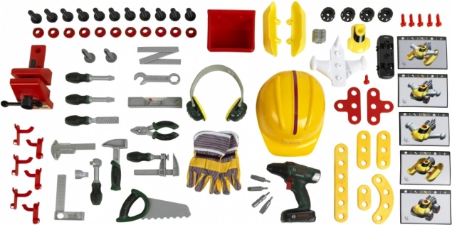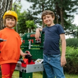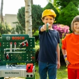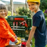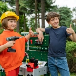 W pełni wyposażony dziecięcy stół warsztatowy jest produkowany w Niemczech na licencji Bosch. Blat oferuje szereg funkcji zabawowych, imadło, praktyczne schowki i półkę odkładczą. Na tylnej ściance stołu majsterkowicza oraz na półce pod blatem jest miejsce na wysokiej jakości 81‑częściowe akcesoria, z których niektóre można zawiesić na ścianie za pomocą praktycznych haczyków: dziecięca elektryczna wkrętarka akumulatorowa, śrubokręt płaski i krzyżakowy, klucz, klucz nastawny, szczypce i pilnik, młotek, piłka i miarka, kątownik, linijka oraz zacisk do śrub. Dzieci nauczą się sprawnie posługiwać śrubami, nakrętkami i elementami wkręcanymi o różnych rozmiarach i kształtach oraz dbać o bezpieczeństwo dzięki zabawkowym kaskom i okularom ochronnym, nausznikom tłumiącym hałas i rękawicom. Szczególnie zabawny jest pojazd do samodzielnego montażu, który można obracać i ponownie składać przy stanowisku pracy. Pokój dziecięcy zamienia się w prawdziwy warsztat! Wystarczy założyć kask i okulary ochronne, włożyć rękawice i można zaczynać ciąć, wbijać i wkręcać. Małym konstruktorom pomaga imadło, które przytrzymuje listewki przeznaczone do mocowania gwoździami lub śrubami. Do dyspozycji jest także wkrętarka akumulatorowa, która dzięki światłu i dźwiękom wkręci wszystko, co mali chcą złożyć, w coś dużego, a gdy praca jest skończona, wszystko można szybko uporządkować na haczykach i w pudełkach.