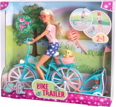 Steffi na rowerze z przyczepką, w zestawie dziecko, pies i kask.