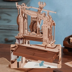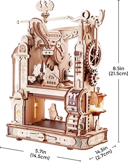 Tchnij życie w klasyczną prasę drukarską w wyjątkowym steampunkowym stylu. Po naciśnięciu dźwigni rozkręcają się koła zębate, figuralne „drukarskie niedźwiedzie” wprawiają maszynę w ruch, a po zakończeniu zadania zapala się światło. Boczne średniowieczne zegary z astrolabium dodają modelowi uroku i autentyczności. Model idealny jako kreatywny projekt DIY, atrakcyjna dekoracja oraz sprytna pomoc edukacyjna rozwijająca myślenie techniczne.