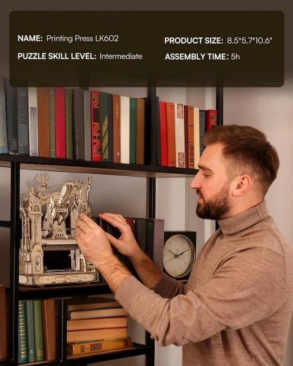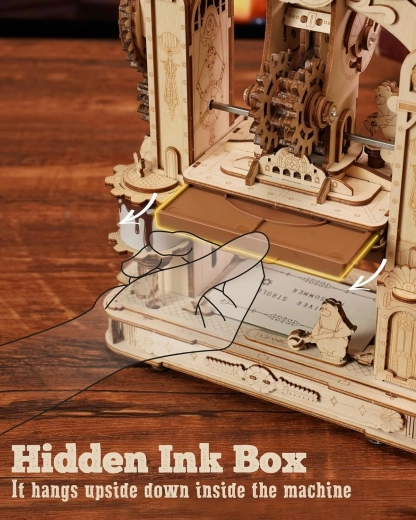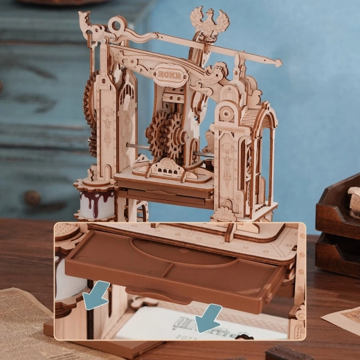 Zbuduj własną miniaturową historyczną prasę drukarską i odkryj urok mechaniki. To precyzyjne drewniane puzzle 3D z mechanicznymi przekładniami, efektem świetlnym i ruchomym drukiem łączą zabawę z walorami dekoracyjnymi. Dzięki mechanizmowi samonamaczania, konfigurowalnej płycie drukowej oraz ponad 100 elementom typograficznym wydrukujesz własne motywy do scrapbookingu, wizytówek i pocztówek. Bez kleju, z laserowo wstępnie wyciętej lipowej sklejki.