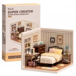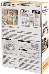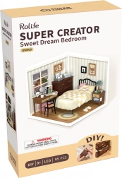 Odkryj urok miniatur z sypialnią Sweet Dream, gdzie naturalne, drewniane tony i kremowo‑żółte detale tworzą ciepłą atmosferę. Zestaw obejmuje łóżko, stolik nocny z lampką, biurko z obrotowym lusterkiem, komodę oraz drobne dekoracje. Dzięki oświetleniu LED wszystkie detale pięknie się wyróżniają, a model staje się efektowną dekoracją.