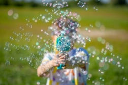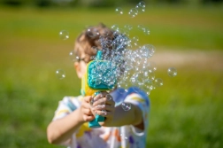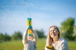 W opakowaniu znajdziesz blaster, płytką miskę oraz 0,4 l wysokiej jakości roztworu do baniek. Wystarczy zanurzyć i zacząć dmuchać.