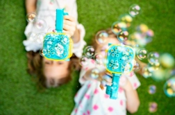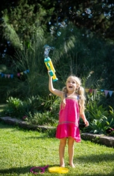 Obsługa jest prosta – zanurz głowicę w misce z roztworem i naciśnij spust. Ergonomiczny uchwyt dobrze leży w dziecięcej dłoni, a lekka, plastikowa konstrukcja wygodnie się trzyma. Zabawka przeznaczona jest do użytku na zewnątrz i zasilana 4× bateriami AA (brak w opakowaniu).
