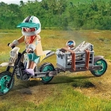 - Zawartość: badaczka PLAYMOBIL, T-Rex, motocykl z wózkiem bocznym, kałuża z odciskiem stopy, lupa, aparat, mapa i inne wyposażenie badawcze.