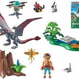 Zestaw zawiera figurkę PLAYMOBIL, dimorfodona, latającą jaszczurkę, drona z kamerą, mikroskop, staw z roślinami i wiele innych fantastycznych dodatków.