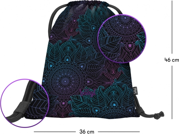 Praktyczny i lekki worek BAAGL Zen zachwyca nowoczesnym designem z mandalą w tonach fioletu i turkusu na czarnym tle. Sprawdzi się na obuwie, sprzęt sportowy oraz drobiazgi, które chcesz mieć zawsze pod ręką. Dzięki wytrzymałemu i zmywalnemu materiałowi bez trudu znosi codzienne użytkowanie.