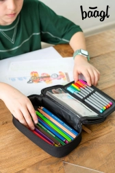 Stylowy i wytrzymały piórnik szkolny BAAGL Darkness oferuje praktyczną organizację przyborów do szkoły i biura. Ma odchylaną przegrodę, wewnętrzną kieszeń na zamek, kieszeń na plan lekcji oraz wysokiej jakości zamki YKK. Wykonany z materiału z recyklingu i dostarczany bez wyposażenia.