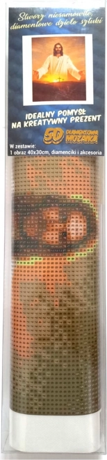 Zawartość opakowania: płótno z nadrukowanym obrazem, aplikator do kamyczków, tacka do wysypywania kamyczków, wosk do przyklejania, zestaw kolorowych kamyczków.