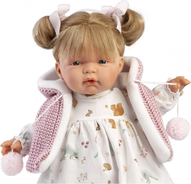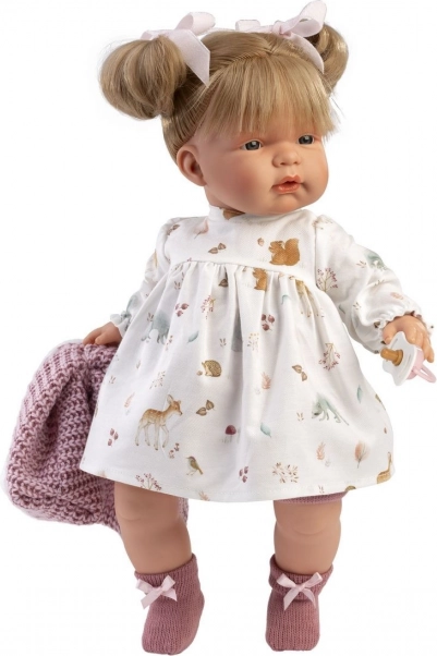 Ręcznie wykonana płacząca lalka Llorens Joelle o wysokości 38 cm zachwyca realistycznym wyglądem, wysokiej jakości materiałami oraz funkcją płaczu po wyjęciu smoczka. W zestawie znajduje się siedmioczęściowe ubranko i smoczek; dołączone baterie LR44. Wyprodukowano w Hiszpanii.