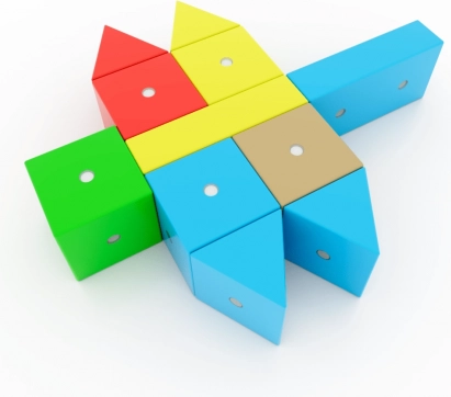 7 kształtów i 5 wyrazistych kolorów inspiruje do tworzenia zwierząt, pojazdów oraz modeli abstrakcyjnych. Broszura z instrukcjami pomaga zacząć i rozwijać wyobraźnię.