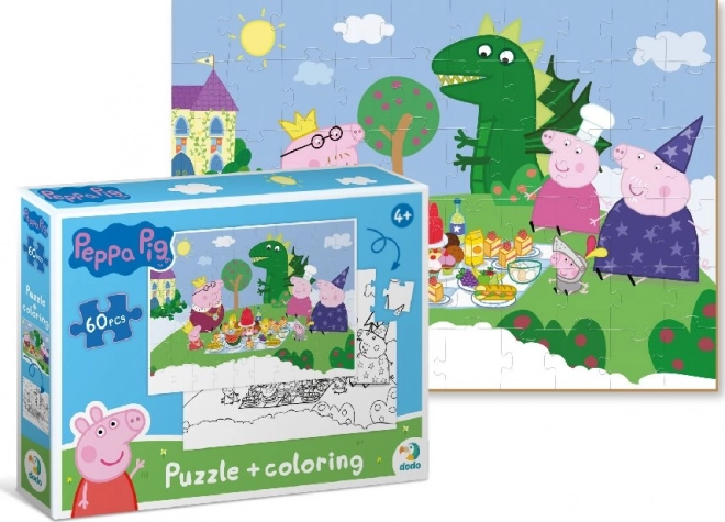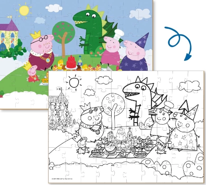 Te dwustronne puzzle dostarczają dzieciom podwójnej porcji zabawy. Najpierw ułożą wesoły motyw z ulubionymi postaciami ze świata Świnki Peppy, a następnie mogą drugą, czarno-białą stronę po ukończeniu pokolorować według własnej wyobraźni. Ułożony obrazek ma wymiary około 32 × 23 cm, więc wygodnie zmieści się na dziecięcym stoliku.