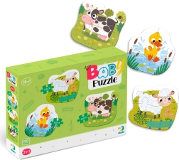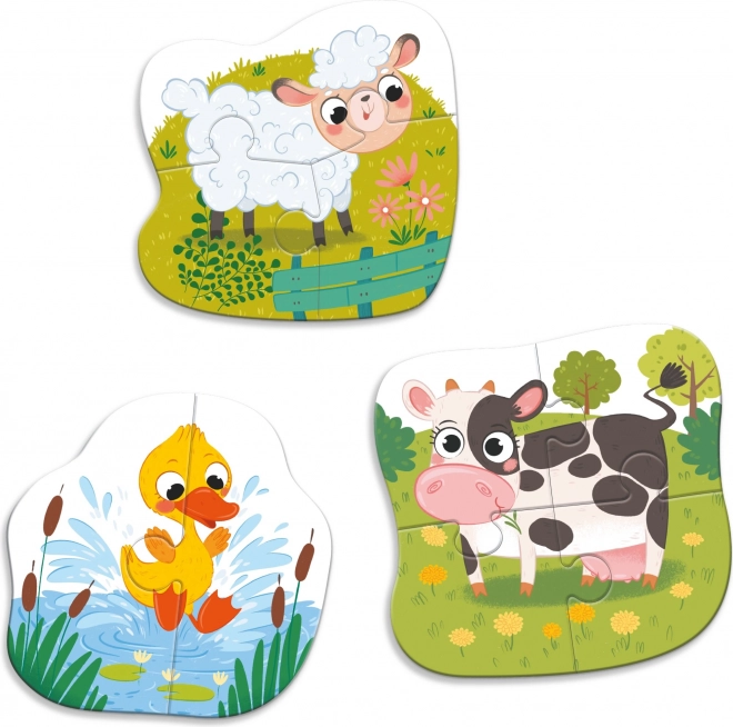Ten zestaw zawiera trzy oddzielne puzzle obrysowe z motywami zwierząt z gospodarstwa, każde z inną liczbą elementów (2, 3 i 4). Dzięki stopniowaniu trudności jest idealny na pierwsze układanki, wzmacnia koncentrację i daje dzieciom radość z sukcesu.