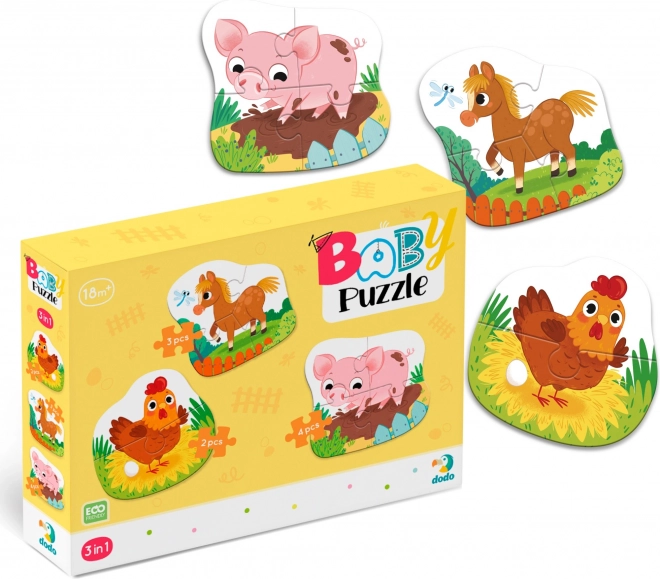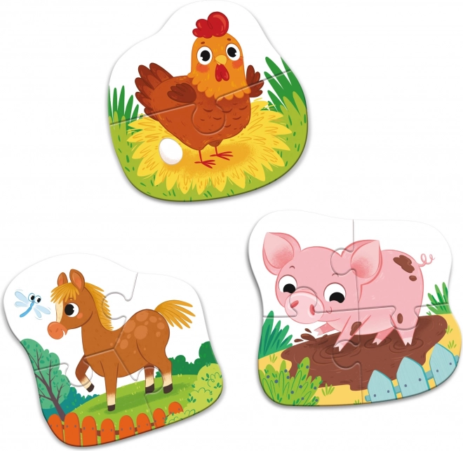 Odkryj pierwsze układanki dla najmłodszych: baby puzzle z trzema konturowymi obrazkami zwierzątek z farmy o poziomach trudności 2, 3 i 4 elementy. Dzięki prostym kształtom i uroczym ilustracjom wspierają dzieci w pierwszych krokach układania, rozwijają wyobraźnię, myślenie logiczne, małą motorykę oraz koordynację ręka–oko.