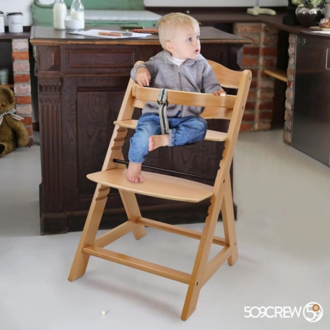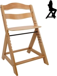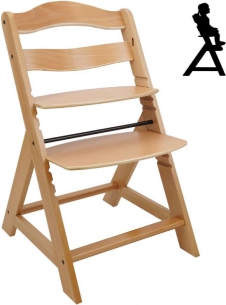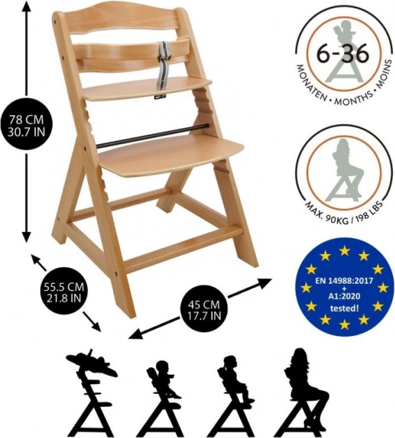 Drewniane rosnące krzesło jadalniane jest zaprojektowane dla maksymalnego komfortu i bezpieczeństwa dzieci od sześciu miesięcy. Wyposażone jest w wielostopniowe ustawienie wysokości siedzenia i podpórki pod nogi, co pozwala na użytkowanie od wczesnego wieku aż do dorosłości. Po osiągnięciu starszego wieku można zdjąć przedni pręt i rozdzielenie w kroku, a krzesło może być przekształcone w normalne krzesło. Jest wykonane z wysokiej jakości niemieckiego drewna bukowego i zapewnia stabilność oraz elegancję. Jego maksymalne obciążenie wynosi do 90 kg.
