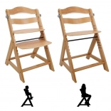 Drewniane wysokie krzesełko, które rośnie razem z dzieckiem. W zestawie drewniana przednia tacka, przedni pałąk oraz rozdzielacz krocza – dla starszych dzieci można je zdjąć i przerobić na zwykłe krzesło także dla dorosłych. Wielostopniowa regulacja wysokości siedziska i podnóżka. Podnóżek można całkowicie zdemontować.