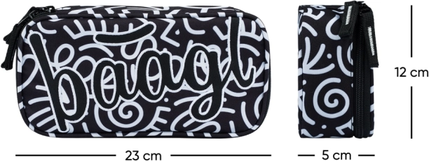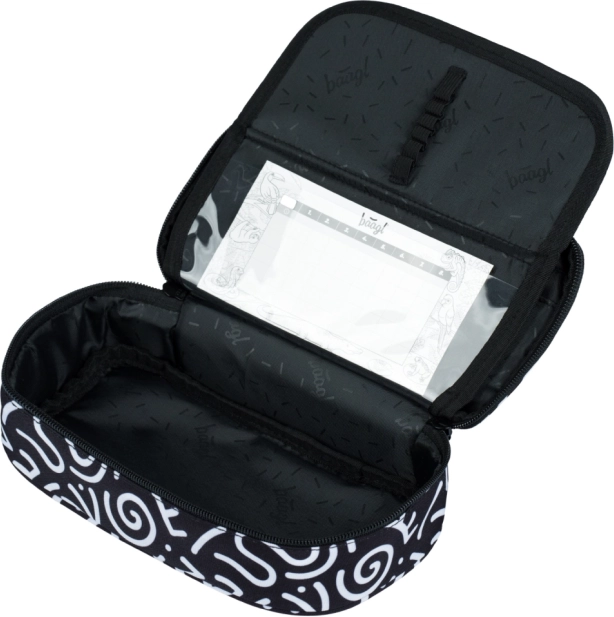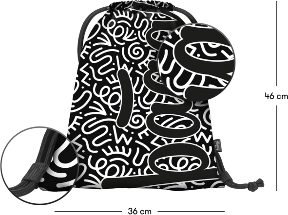 Solidny piórnik-etui z odchylaną przegrodą, kieszonką na zamek oraz miejscem na plan lekcji. Zmywalny worek z mocnymi sznurkami nadaje się na obuwie i aktywności pozaszkolne.