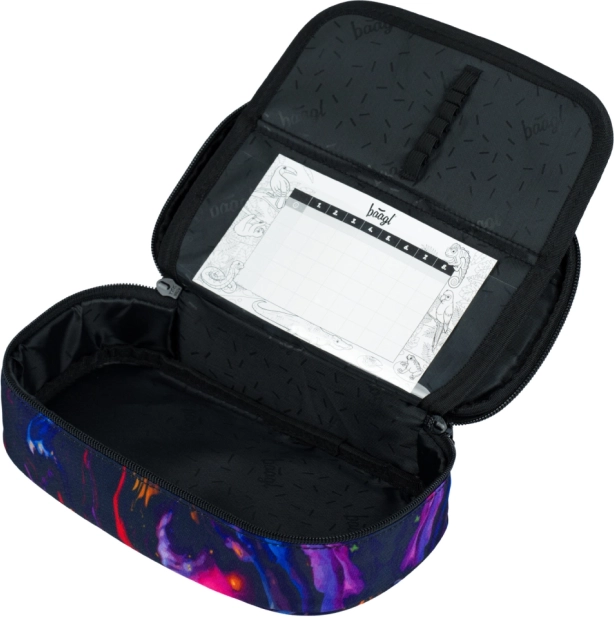 Solidny piórnik z odchylaną przegrodą, kieszenią na zamek i miejscem na plan lekcji (bez wyposażenia). Wytrzymały worek ze ściągaczem i mocnymi sznurkami do noszenia na plecach.