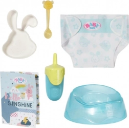Zestaw zawiera butelkę, smoczek, smoczek z wstążką, pieluchy i inne akcesoria do pełnej pielęgnacji i zabawy.