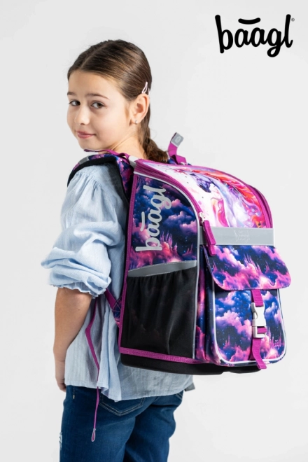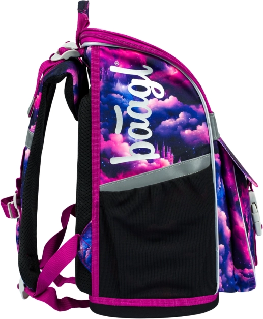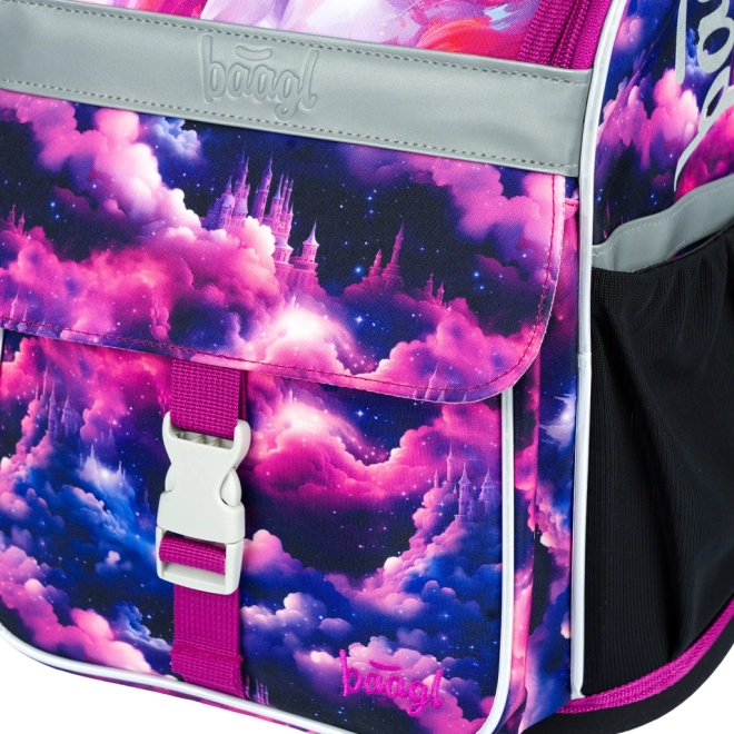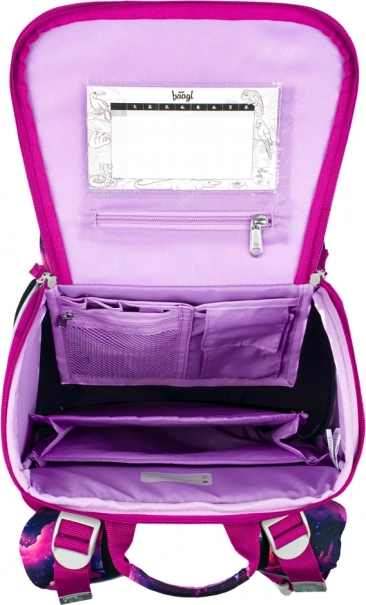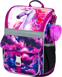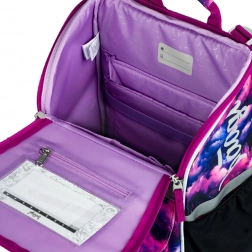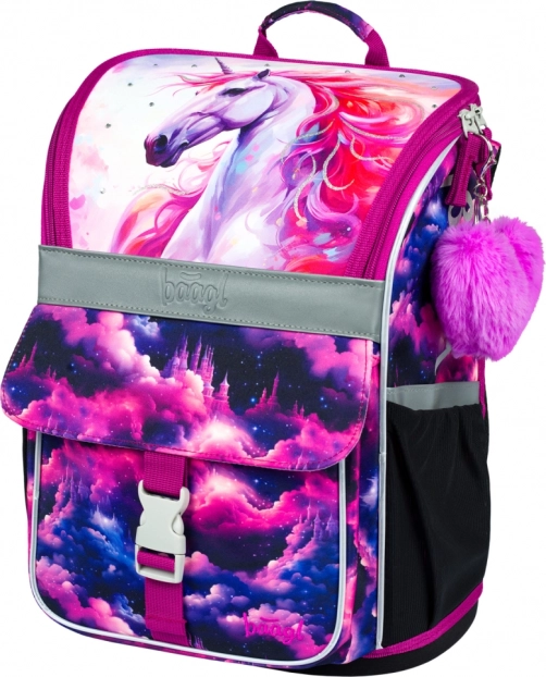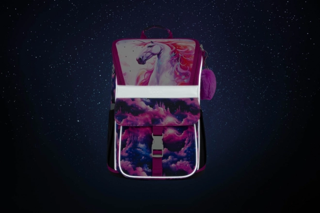 Stylowy motyw Jednorożec Królestwo w różowo-fioletowych tonach zachwyci dzieci. Elementy odblaskowe zwiększają bezpieczeństwo, a solidna konstrukcja utrzymuje kształt przez cały szkolny dzień.