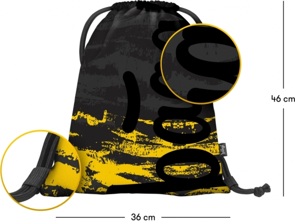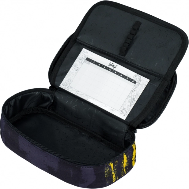 Solidny piórnik z odchylaną przegrodą i kieszonką na plan lekcji + worek z mocnymi sznurkami na obuwie lub akcesoria sportowe.