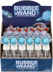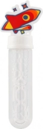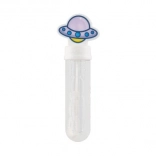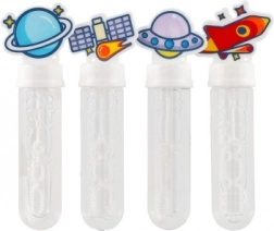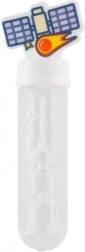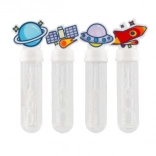 Każda bańka mydlana ma zakrętkę z różnymi kosmicznymi motywami, jak planeta, satelita, UFO czy rakieta.