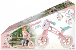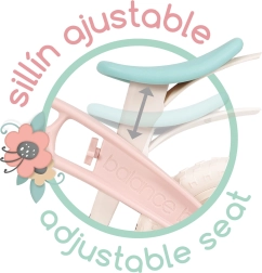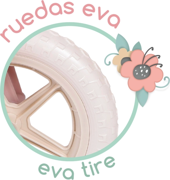 Praktyczne wyposażenie obejmuje bezobsługowe koła EVA (nie da się ich przebić), regulowane, anatomicznie ukształtowane siodełko, gumowane chwyty przeciw obracaniu, błotniki oraz przednią saszetkę na rzep na drobiazgi. Rowerek wykonany jest z wysokiej jakości materiałów z precyzyjnym wykończeniem i odpowiada potrzebom początkujących małych rowerzystów.