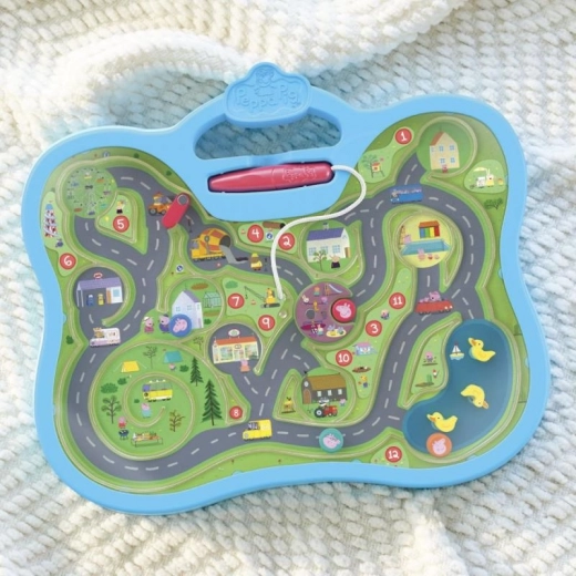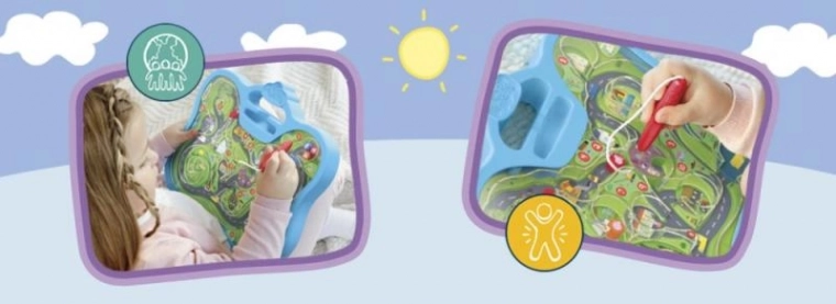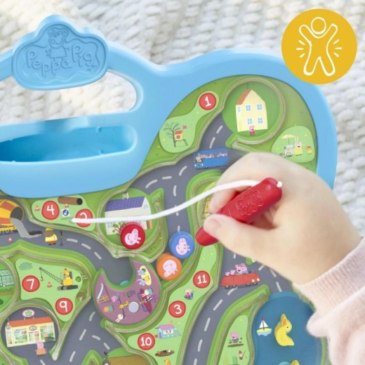 Stabilna plansza z wbudowanym uchwytem i na stałe przymocowanym rysikiem świetnie sprawdza się do zabawy w domu i w podróży. Ponumerowane punkty wspierają naukę liczb i sekwencji, a barwne ilustracje ulubionych miejsc z bajek o Peppie Pig przyciągają uwagę i zachęcają do dalszego odkrywania.