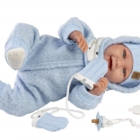 Ta realistyczna lalka jest doskonałym wyborem dla wszystkich małych rodziców. Lalka potrafi siedzieć a jej ręce i nogi są przymocowane do ciała za pomocą przegubów, co umożliwia różnorodne pozy. Dostarczana jest ze smoczkiem jako dodatkiem, co jeszcze bardziej przyczynia się do perfekcyjnej iluzji bobasa. Ręczna robota w Hiszpanii zapewnia wysoką jakość wykonania i autentyczność. Rozmiar lalki wynosi 44 cm, co jest idealne dla dzieci od 3 roku życia. Lalka jest dostarczana w ozdobnym pudełku, co czyni ją także świetnym prezentem. W zestawie znajdują się 3 baterie guzikowe LR44 oraz instrukcja ich wymiany. Baterie są zużywane, dlatego ich wyczerpanie nie jest powodem do reklamacji.