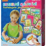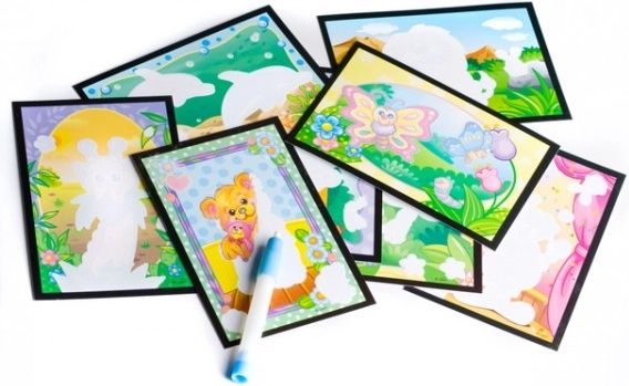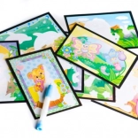 Instrukcja: Otwórz magiczny pisak, napełnij go wodą i zamknij. Przesuwaj po odpowiednich częściach obrazków, aż się wybarwią. Dla młodszych dzieci można użyć także zwykłego pędzelka i kubeczka z wodą.