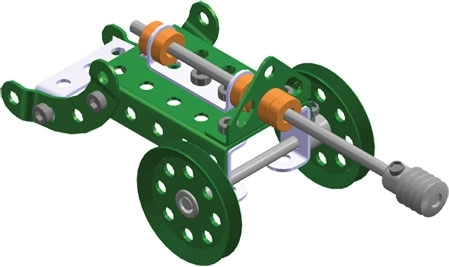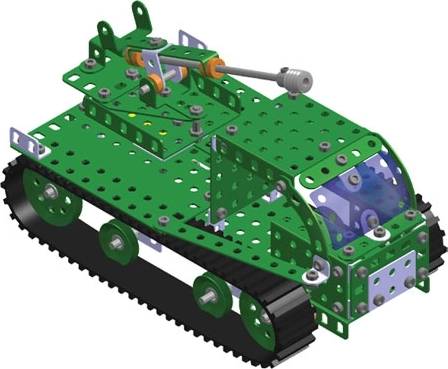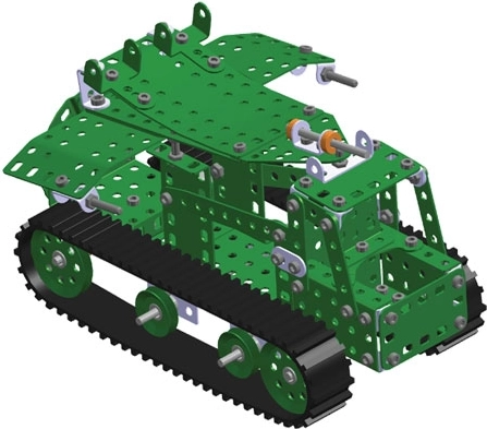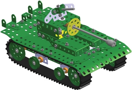 Perforowane metalowe profile, śrubki i gąsienice pozwalają tworzyć solidne i szczegółowe modele czołgów z obrotową wieżą i efektownym wyglądem.