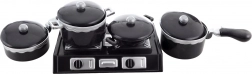 Zawiera 3 garnki, patelnię wok, 4 pokrywki, kuchenkę oraz dodatkowe akcesoria do realistycznej zabawy w gotowanie.