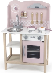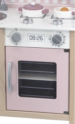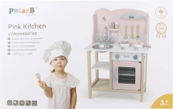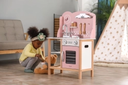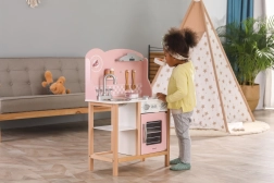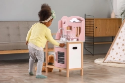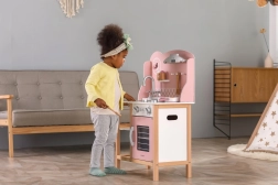 Dziecięca kuchnia VIGA PolarB w delikatnej różowo-białej kolorystyce wspiera kreatywną zabawę, samodzielność i umiejętności społeczne. Dzięki realistycznym elementom — od zlewu z baterią, przez piekarnik z drzwiczkami, po obrotowe pokrętła z charakterystycznym „kliknięciem” — dzieci sprawdzą, jak to jest gotować, piec i sprzątać jak dorośli. Drewniana konstrukcja z gładkimi krawędziami i powierzchnia wykończona bezpiecznymi, nietoksycznymi farbami zapewniają długą żywotność i bezpieczeństwo podczas zabawy.