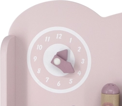 W zestawie znajduje się także praktyczna przestrzeń do przechowywania z półką, wiszącymi haczykami na akcesoria oraz zegar do zabawnej nauki czasu. Bogaty komplet dodatków — garnek z pokrywką, patelnia z jajkiem sadzonym, łyżka, łyżka cedzakowa, szpatułka, solniczka i pieprzniczka — pozwoli dzieciom przygotować „menu” dla całej rodziny.