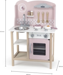 Zlew z baterią, piekarnik z przezroczystymi drzwiczkami, płyta grzewcza i okap tworzą autentyczne środowisko, które zachęca dzieci do samodzielnej i pomysłowej zabawy.