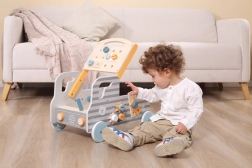 Ten jeżdżący warsztat w kształcie auta łączy stół roboczy z interaktywnym zestawem konstrukcyjnym. Wszystko wykonane jest z drewna i dopasowane do małych rączek, aby dzieci mogły bezpiecznie spróbować pracy z narzędziami. Zestaw pobudza ciekawość, uczy cierpliwości i wspiera koordynację ręka–oko.