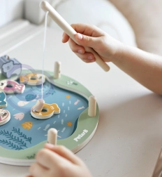 Drewniana magnetyczna gra w łowienie rybek to świetny wybór na pierwsze gry towarzyskie. Kolorowe, ponumerowane rybki z kropkami łowi się przy pomocy magnetycznych wędek, dzięki czemu dzieci w zabawny sposób ćwiczą liczenie, koncentrację i cierpliwość. Kostka dodaje grze element losowości i emocji – wygrywa ten, kto złowi właściwą rybkę.