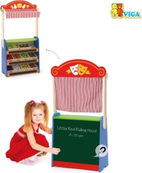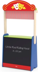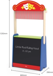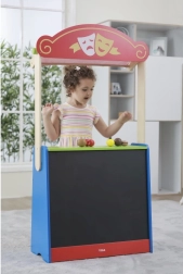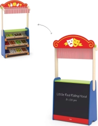 Ta wysokiej jakości drewniana zabawka łączy domowy teatrzyk kukiełkowy oraz dziecięcy sklepik w jednym. Dzieci mogą w mgnieniu oka zmieniać sceny i role – gdy trwa przedstawienie, zasuwają kurtynę i na czarnej tablicy zapisują tytuł spektaklu; podczas zabawy w sklep – nazwę sklepiku, ceny czy promocje.