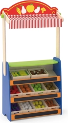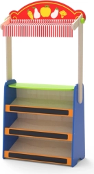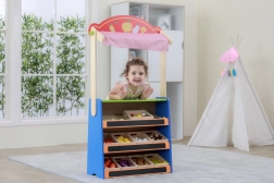 Stoisko oferuje przejrzyste półki do przechowywania produktów i akcesoriów (sprzedawane oddzielnie). Solidne wykonanie, atrakcyjne kolorowe detale i markiza zachęcają do twórczej zabawy i wspólnych aktywności. Zabawka rozwija wyobraźnię, kreatywność, logiczne myślenie oraz komunikację.