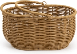 - Drewno, tekstylia; koszyk z syntetycznej „trzcininy”