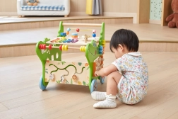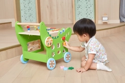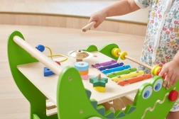 - ksylofon, liczydło, labirynt ze zwierzątkami, kółka zębate, sorter kształtów, obrotowe klocki z liczbami i obrazkami, pętla motoryczna z 5 koralikami, przesuwny blok, dzwoniący talerz, gong, układanka kołeczkowa