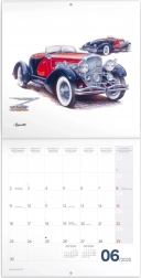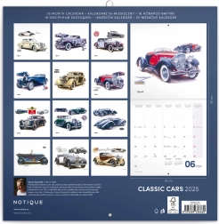 Odkryj elegancję klasycznych samochodów w ściennym kalendarzu notatkowym na rok 2025 z pracami VÁCLAVA ZAPADLÍKA. Każdy miesiąc zdobi szczegółowa ilustracja legendarnych klasyków, które ucieszą kolekcjonerów, miłośników motoryzacji i ponadczasowego designu.