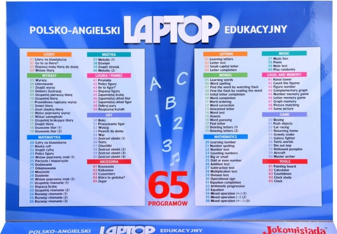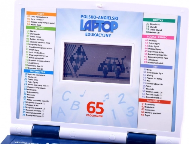 Interaktywny edukacyjny laptop dla dzieci oferuje 65 zabawnych i pouczających funkcji w języku polskim i angielskim. Dzięki wyświetlaczowi LCD, programom do nauki liter, słów i liczb, aktywnościom muzycznym oraz grom logicznym wspiera rozwój pamięci, logicznego myślenia i motoryki małej. Idealny do nauki przez zabawę w domu i w podróży.