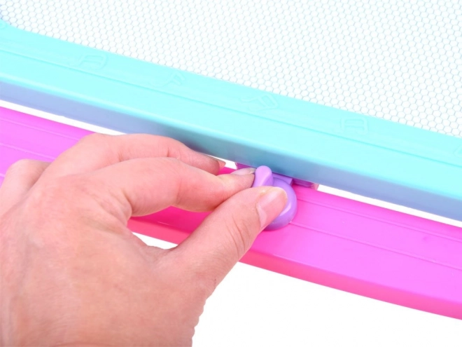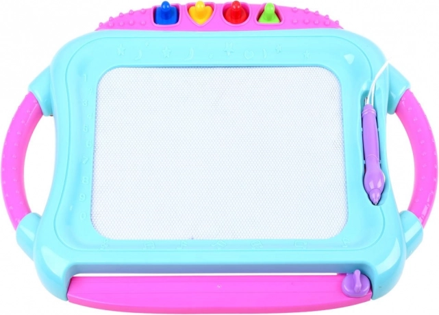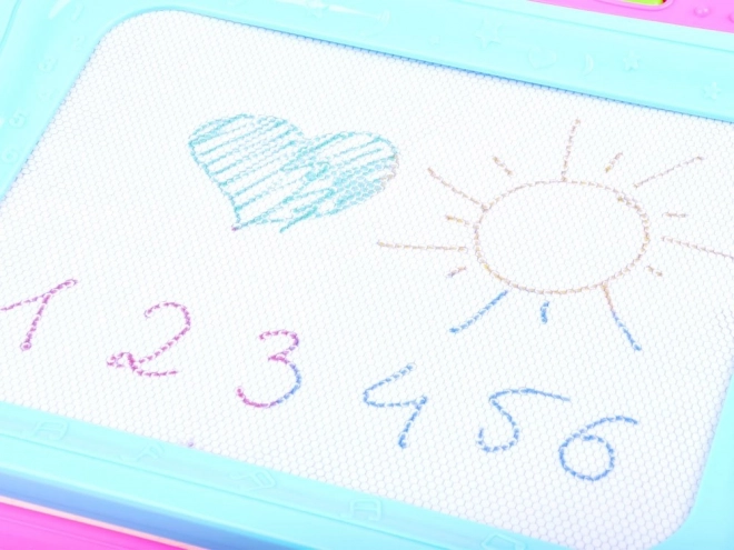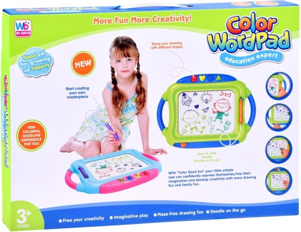 Ta kolorowa magnetyczna tablica umożliwia rysowanie i pisanie bez bałaganu. Czterokolorowe tło zmienia odcienie w zależności od miejsca rysowania, dzięki czemu każdy obrazek zyskuje żywy, wielobarwny efekt. Dzieci mogą tworzyć rysikiem lub odbijać kształty za pomocą pieczątek, rozwijając wyobraźnię i koordynację oko–ręka.
